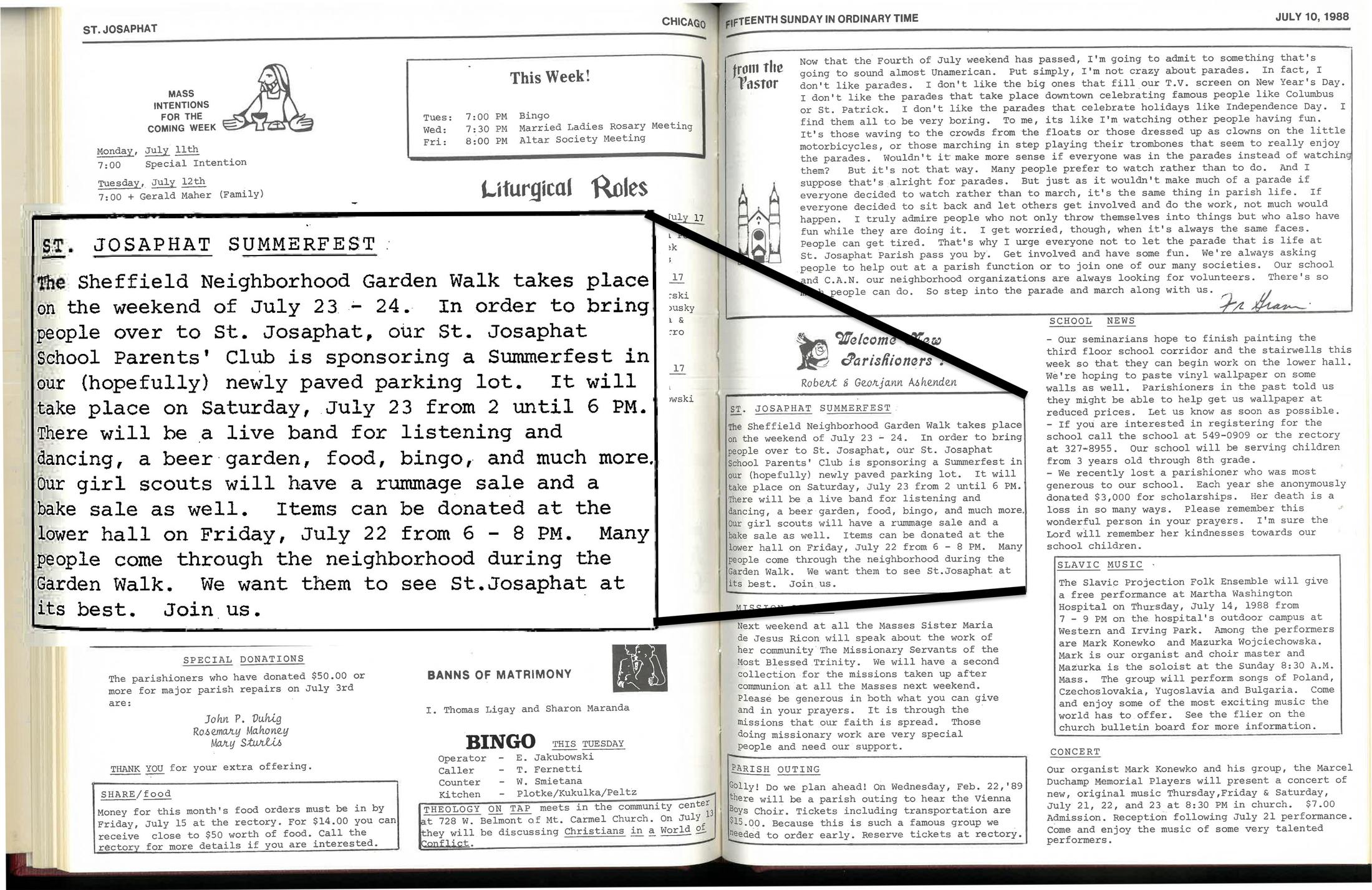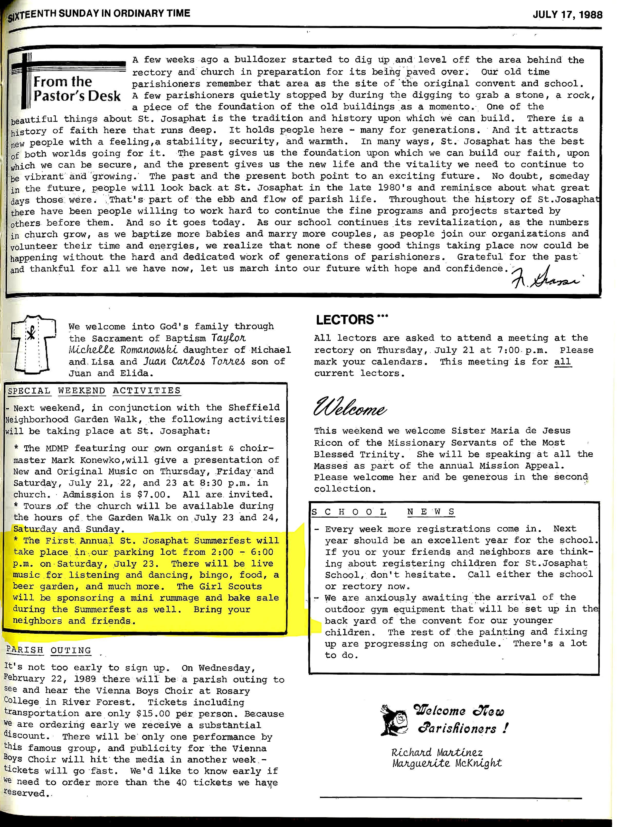 Our annual parish festival began in 1988 as "Summerfest" under Fr. Dominic Grassi. It was intended as a way to draw neighbors to our parish during the Sheffield Garden Walk.